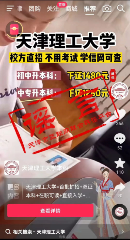 接網(wǎng)民舉報,網(wǎng)上正在傳播“天津理工大學(xué) 雙證本科 不用考試 學(xué)信網(wǎng)可查”等信息,引發(fā)網(wǎng)民關(guān)注。經(jīng)核查,此信息為虛假宣傳。