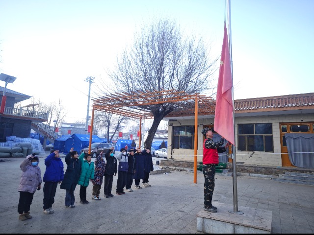 “全體都有,稍息,立正……出發(fā)。”12月22日,震后第4天,清晨7點40,甘肅省積石山縣劉集鄉(xiāng)高李村一社安置點幾排帳篷中間的空地傳來中氣十足的整隊口號,10多名學生排著整齊的隊伍,跟著“教官”齊步前進。今天,他們要在安置點前的小廣場舉行升國旗儀式,隨后開啟他們的災后“第一課”,這一刻起,高李村一社臨時“帳篷學?!背闪⒘?。