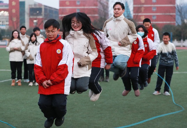 支教大學(xué)生王楠(前左二)、黃春皓在社團(tuán)活動(dòng)中和中學(xué)生一起開(kāi)展跳繩活動(dòng)。