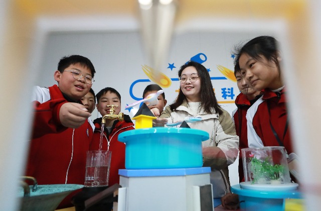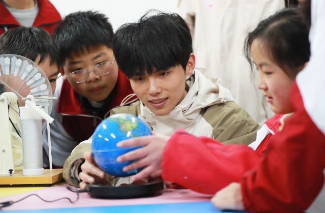 支教大學(xué)生韓金定在科技小屋教學(xué)生使用磁懸浮地球儀。