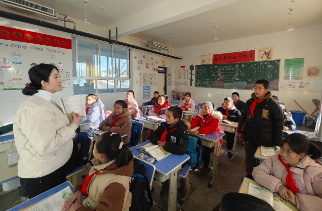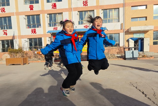 12月25日,陽山希望小學的課間時分,五年級學生趙永蘭和小伙伴開心地在操場上比賽跳繩。