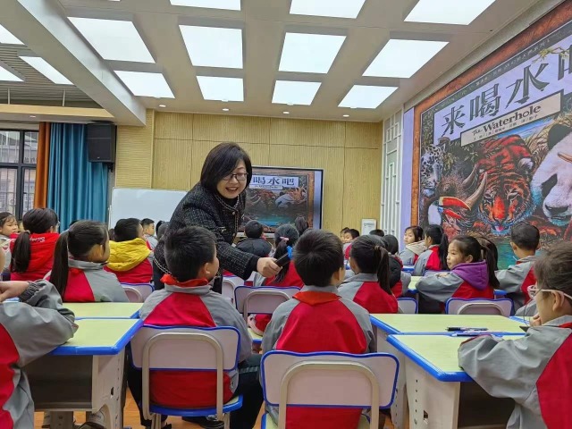 走進張艷霞的辦公室,桌面上堆滿了很多書籍。澳大利亞作家葛瑞米·貝斯的作品《來喝水吧》總會放在最明顯的位置。這本書,張艷霞已數(shù)不清執(zhí)教了多少次。看似簡單的圖畫書,里面涵蓋了語文閱讀、數(shù)學(xué)分析、生物研究、藝術(shù)鑒賞……幾乎所有的學(xué)科教師,都可以從這本書中找到教學(xué)切入點。“跟著書上青蛙‘探’游世界”,我們開展了動物情景劇、繪畫展、童謠歌會等多樣的活動,學(xué)生們還制作了屬于自己的探秘手冊。”帶著孩子們慢慢品讀,探尋世界的奧秘,張艷霞發(fā)現(xiàn)這更是閱讀的價值。