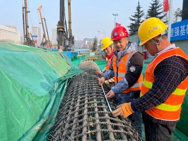 ??2024年2月9日,在中建八局承建的濟南軌道交通7號線一期工程的龍奧大廈站施工現(xiàn)場,質(zhì)量工程師劉學(中)在檢查鋼筋籠焊接質(zhì)量。新華社發(fā)