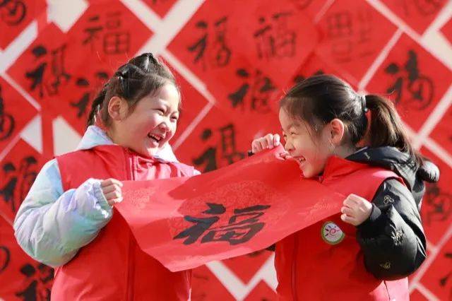 小朋友展示書法志愿者贈送的福字 李海濤 攝