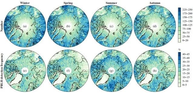 2006.12–2019.11期間各季節(jié)的到達北極地表500m以內的掩星觀測數(shù)量的空間分布,以及對應的北極大氣邊界層高度的探測頻率的空間分布。學校供圖