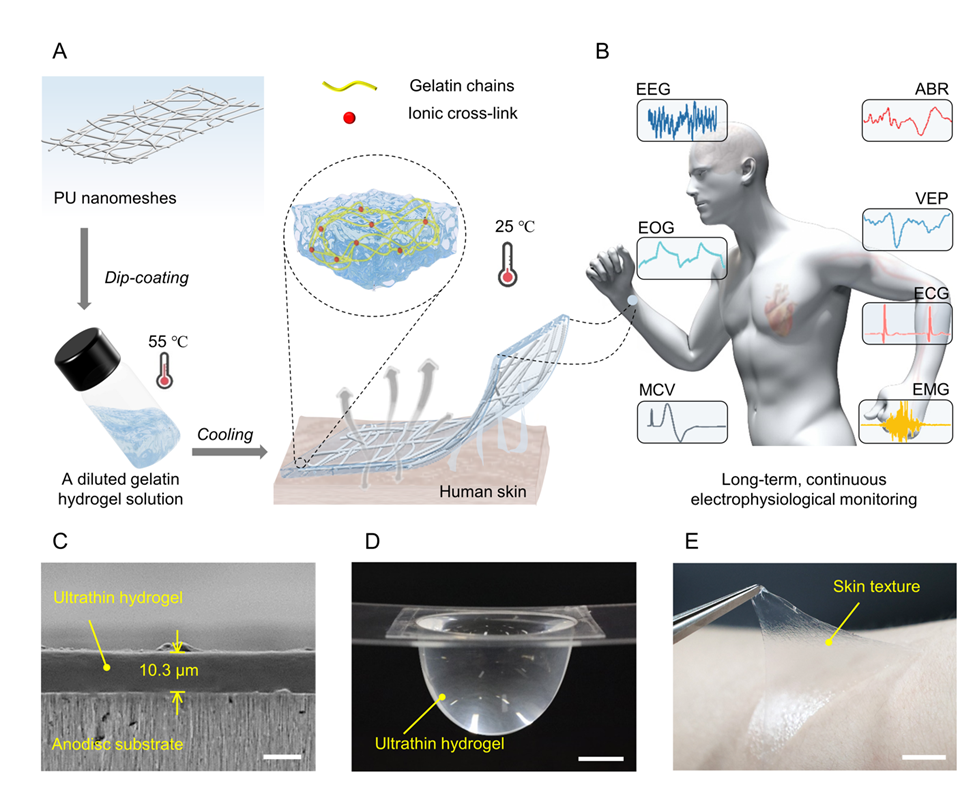 該研究包括兩個(gè)關(guān)鍵步驟:首先,設(shè)計(jì)明膠熱敏相變水凝膠材料;其次,通過(guò)納米網(wǎng)格增強(qiáng)結(jié)構(gòu)實(shí)現(xiàn)超薄韌特性。由此得到水凝膠皮膚電極厚度低至10微米,并表現(xiàn)出優(yōu)異機(jī)械魯棒性、皮膚粘附性、透氣性和抗失水性能。為了展現(xiàn)其在疾病早期發(fā)現(xiàn)及治療方面的應(yīng)用,課題組展示了在日常穿戴條件下該水凝膠電極對(duì)人體心電圖、肌電圖、運(yùn)動(dòng)傳導(dǎo)速度、眼電圖、腦電圖、聽(tīng)覺(jué)腦干反應(yīng)、視覺(jué)誘發(fā)電位等信號(hào)的高保真長(zhǎng)期連續(xù)監(jiān)測(cè)。