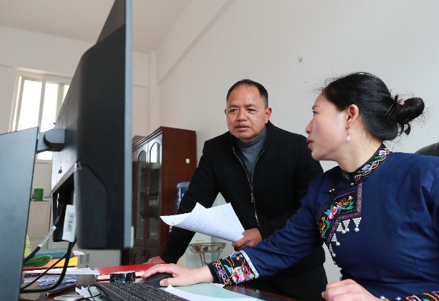 2月26日,農(nóng)加貴就即將提交的建議,征求全國(guó)政協(xié)委員、廣南縣城區(qū)第四小學(xué)校長(zhǎng)龔健梅(右)的意見(jiàn)。