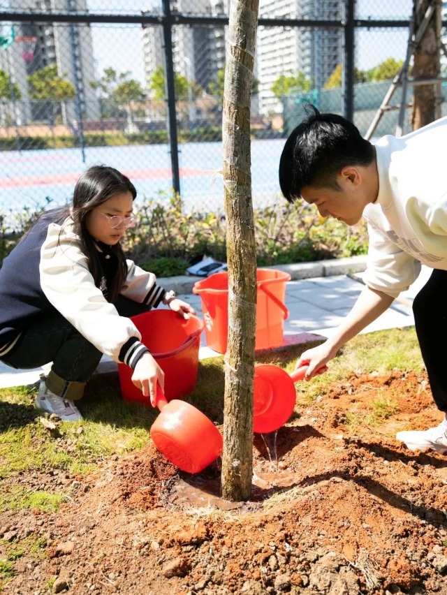 活動(dòng)現(xiàn)場(chǎng),參加植樹的同學(xué)們合力扶樹正苗、填土圍堰、培土踩實(shí)、提水澆灌,各個(gè)環(huán)節(jié)銜接有序。大家熱情高漲、配合默契,共同在廣以校園內(nèi),繪制出一幅早春風(fēng)景圖。