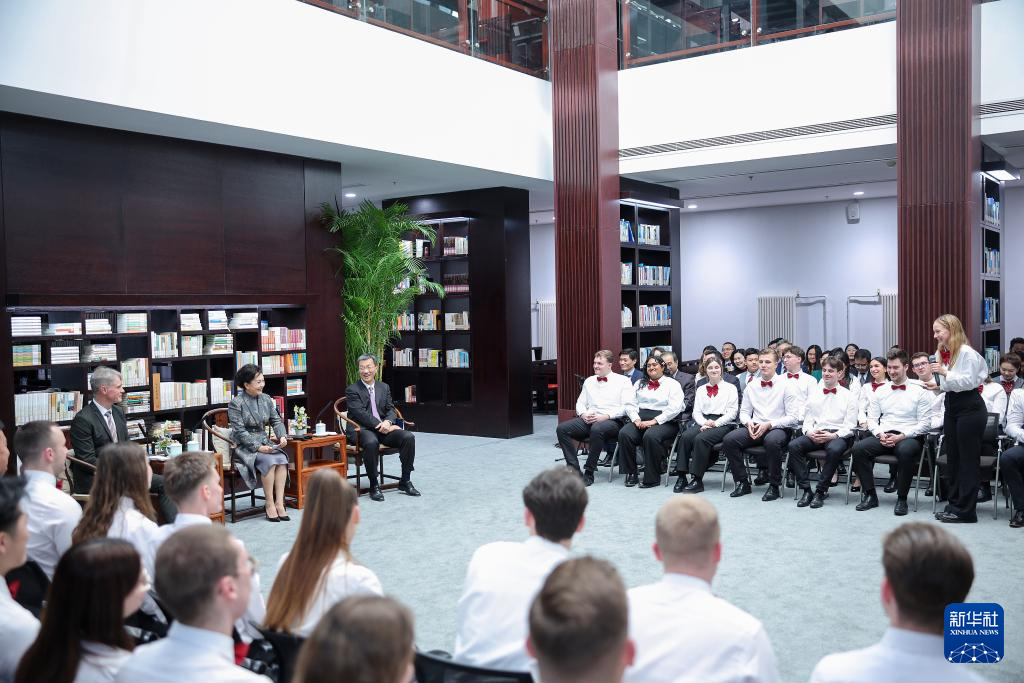 3月28日下午,國(guó)家主席習(xí)近平夫人彭麗媛在北京市第三十五中學(xué)會(huì)見來華參訪的德國(guó)伯樂中文合唱團(tuán)師生代表。這是彭麗媛來到學(xué)校書院,受到師生們熱情歡迎。新華社記者謝環(huán)馳攝