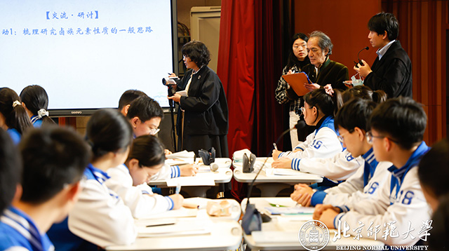 圖為佐藤學(xué)觀摩北京市第十八中學(xué)化學(xué)課《元素周期表的應(yīng)用——研究鹵族元素的性質(zhì)》教學(xué)現(xiàn)場 北京師范大學(xué)供圖