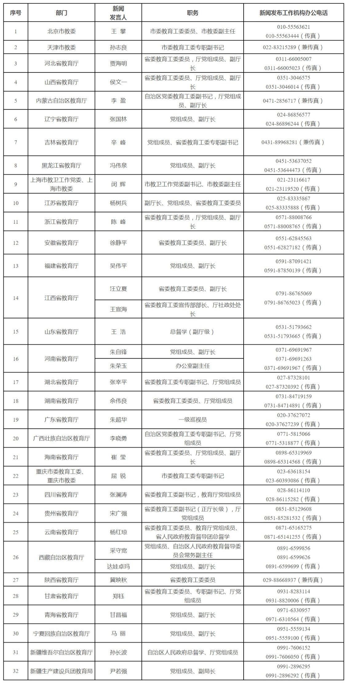 各?。▍^(qū)、市)教育部門新聞發(fā)言人名單和新聞發(fā)布工作機(jī)構(gòu)電話