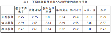 鄉(xiāng)村教師收入待遇逐年提高但有上升空間。鄉(xiāng)村教師收入待遇逐年提高,鄉(xiāng)村教師高于同層次鎮(zhèn)區(qū)教師,但低于城區(qū)教師。課題組調(diào)研數(shù)據(jù)表明:鄉(xiāng)村教師月收入在3000元以上的比例占66.97%,高于鎮(zhèn)區(qū)教師(含鎮(zhèn)中心區(qū)、鎮(zhèn)鄉(xiāng)接合區(qū)、特殊區(qū)域)的66.11%,但低于城區(qū)教師(含主城區(qū)、城鄉(xiāng)接合部)73.27%的比例。鄉(xiāng)村教師對(duì)自己收入結(jié)構(gòu)要素的滿意度總分是2.79分,優(yōu)于鎮(zhèn)區(qū)教師和城區(qū)教師的2.67分和2.73分。(見(jiàn)表1)