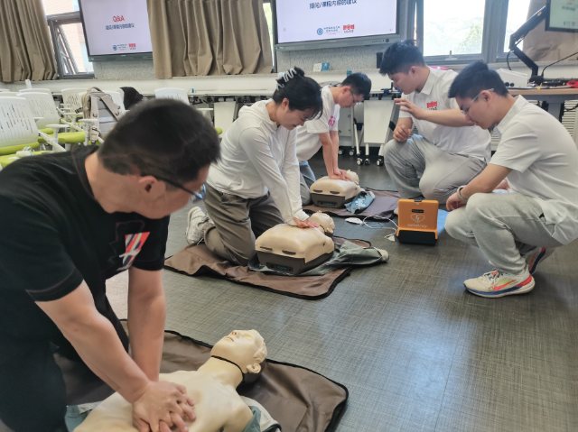 培訓現(xiàn)場,同學們輪流模擬實操心肺復蘇、AED使用等急救技能 學校供圖