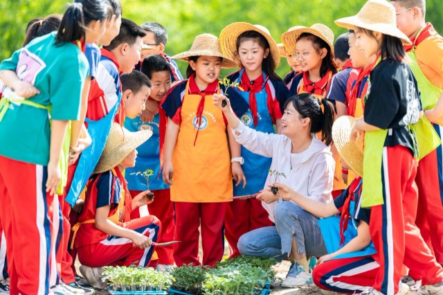 老師在“校園農(nóng)場”內(nèi)向?qū)W生傳授栽種西紅柿秧苗的注意事項。通訊員 丁根厚 攝