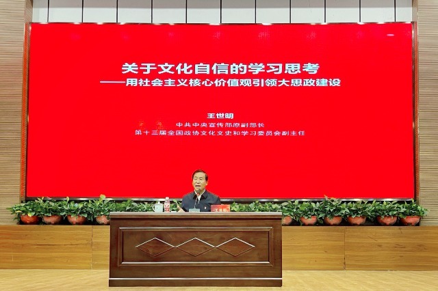 中國教育報(bào)-中國教育新聞網(wǎng)訊(通訊員 司宣)為深入學(xué)習(xí)貫徹習(xí)近平總書記近日對學(xué)校思政課建設(shè)作出的重要指示精神,牢牢把握教育的政治屬性、戰(zhàn)略屬性、民生屬性,5月16日,大連藝術(shù)學(xué)院黨委邀請中共中央宣傳部原副部長、第十三屆全國政協(xié)文化文史和學(xué)習(xí)委員會(huì)副主任王世明同志做客學(xué)院,作題為《關(guān)于文化自信的學(xué)習(xí)思考——用社會(huì)主義核心價(jià)值觀引領(lǐng)大思政建設(shè)》的宣講報(bào)告。
