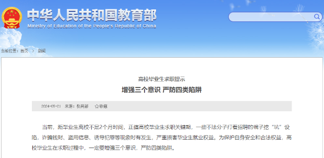 當(dāng)前,距畢業(yè)生離校不足2個(gè)月時(shí)間,正值高校畢業(yè)生求職關(guān)鍵期,一些不法分子打著招聘的幌子挖“坑”設(shè)陷,詐騙錢財(cái)、盜用信息、誘導(dǎo)犯罪等現(xiàn)象時(shí)有發(fā)生,嚴(yán)重?fù)p害畢業(yè)生就業(yè)權(quán)益。為保護(hù)自身安全和合法權(quán)益,高校畢業(yè)生在求職過程中,一定要增強(qiáng)三個(gè)意識(shí),嚴(yán)防四類陷阱。
