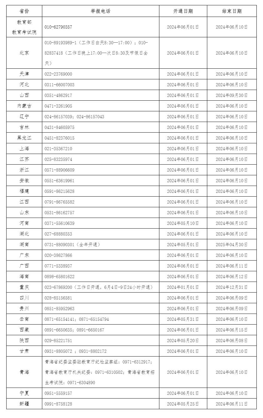 近日,教育部統(tǒng)一公布了教育部以及各?。▍^(qū)、市)2024年的高考舉報電話,歡迎廣大考生、家長及社會各界人士及時舉報反映涉及2024年高考的問題線索。教育部及各省(區(qū)、市)將會同有關(guān)部門根據(jù)舉報線索第一時間核查處理,堅決維護(hù)高考公平公正。