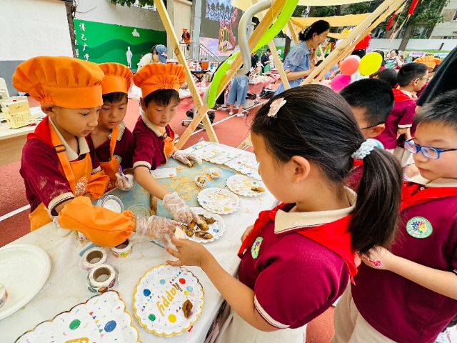 展位旁,孩子們擔(dān)任講解員,聲音響亮地介紹自己的勞動(dòng)創(chuàng)意作品。“美食大排檔”上,皮薄餡多的餃子、軟糯香甜的粽子、香醇可口的蛋撻,散發(fā)著誘人的香氣?!靶N師”熱情為同學(xué)送上美味的食物,有的還在現(xiàn)場(chǎng)制作,忙得不亦樂乎。