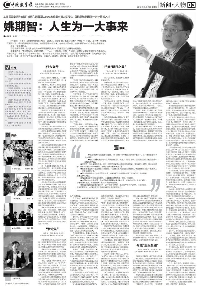 中國(guó)教育報(bào)曾多次專題報(bào)道姚期智院士回國(guó)任教的先進(jìn)事跡和心路歷程,其中,本報(bào)記者、時(shí)任人物版主編趙秀紅曾在2012年對(duì)其進(jìn)行整版專訪。舊文有溫度,現(xiàn)將這篇報(bào)道與讀者分享。