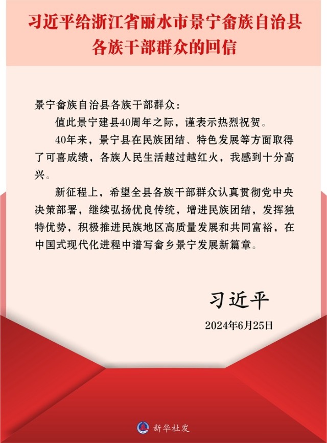 新華社北京6月26日電 中共中央總書(shū)記、國(guó)家主席、中央軍委主席習(xí)近平近日給浙江省麗水市景寧畬族自治縣各族干部群眾回信,向景寧建縣40周年表示熱烈祝賀,對(duì)景寧發(fā)展提出殷切希望。