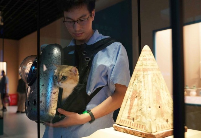 7月27日,寵物貓與主人在上海博物館“金字塔之巔:古埃及文明大展”“薩卡拉的秘密”展區(qū)內(nèi)觀展。新華社發(fā)(陳浩明 攝)