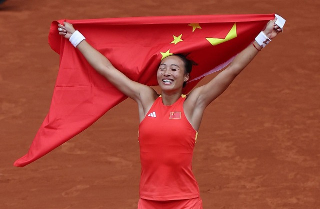 8月3日,中國選手鄭欽文在贏得網(wǎng)球女子單打金牌賽后身披國旗慶祝奪冠。