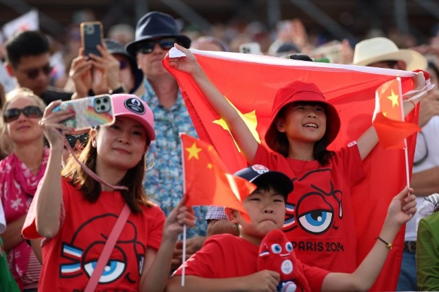 7月30日,觀眾在巴黎奧運會乒乓球混雙決賽現(xiàn)場加油助威。