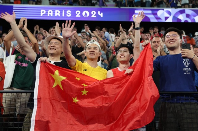 7月31日,觀眾在比賽羽毛球混合雙打四分之一決賽現(xiàn)場為中國選手加油。