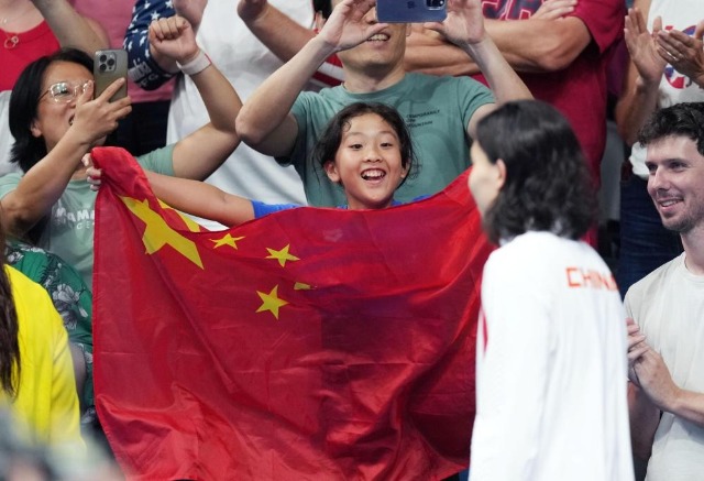 8月1日,一位小觀眾在頒獎儀式后揮舞中國國旗。在巴黎奧運會游泳項目女子4x200米自由泳接力決賽中,中國隊獲得季軍。