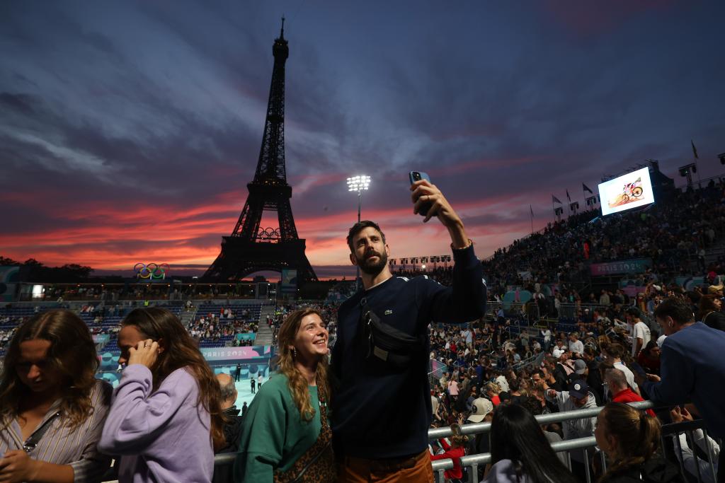 7月27日,觀眾在埃菲爾鐵塔體育場拍照留影。當日,巴黎奧運會沙灘排球比賽在埃菲爾鐵塔體育場舉行。新華社記者 黃宗治 攝