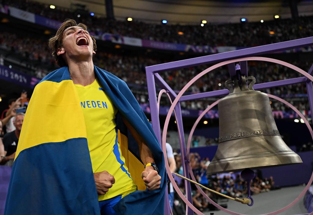 8月5日,在法蘭西體育場舉行的巴黎奧運會田徑男子撐桿跳高決賽中,瑞典選手杜普蘭蒂斯以6米25的成績奪金,并將自己保持的世界紀錄提升了1厘米。新華社記者 宋彥樺 攝