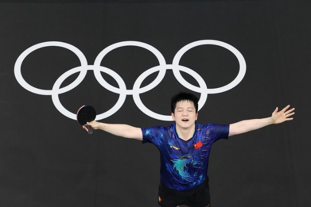 中國選手樊振東在巴黎奧運(yùn)會(huì)乒乓球男單四分之一決賽中戰(zhàn)勝日本選手張本智和,晉級(jí)四強(qiáng)(2024年8月1日攝)。新華社記者 徐子鑒 攝