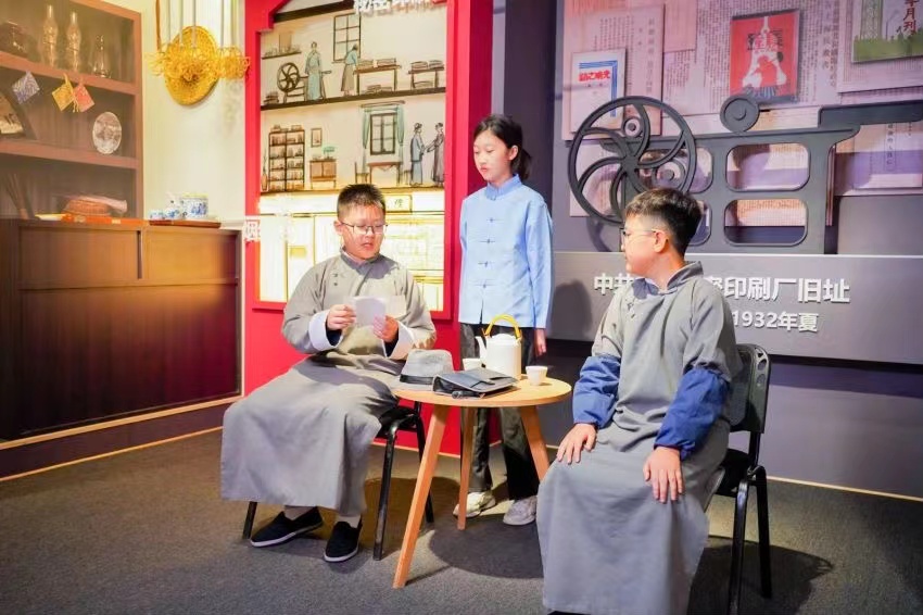 此外,學(xué)生們還結(jié)合展覽內(nèi)容與展陳空間,排練了短劇《真理的味道是甜的》《1925年5月30日》與《秘密印刷廠》,以情景短劇的形式呈現(xiàn)歷史,將展廳化為歷史現(xiàn)場,讓學(xué)習(xí)變得更為生動、立體、深入。