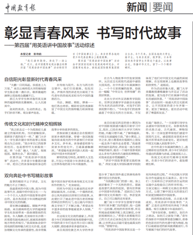 在第四屆“用英語講中國故事”活動中,許多青少年也像郭亦捷一樣,樂于把自己的親身體驗(yàn)和身邊的故事,分享給更多的朋友。