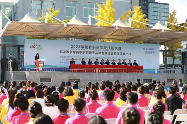 2024年世界職業(yè)院校技能大賽總決賽爭奪賽中職組教育與體育賽道嬰幼兒保育小組開賽。圖為10月28日開賽式。北京市求實(shí)職業(yè)學(xué)校供圖