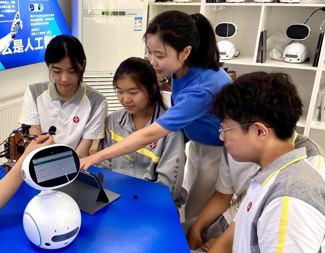 “老師快看!‘小飛’和我互動(dòng)了!”在天津益中學(xué)校的人工智能實(shí)驗(yàn)室里,學(xué)生們?cè)诶蠋煹闹笇?dǎo)下操控平板電腦進(jìn)行編程,看到“小飛”智能機(jī)器人依據(jù)指令與學(xué)生們對(duì)話并完成指定的動(dòng)作。憨態(tài)可掬的“小飛”機(jī)器人還根據(jù)設(shè)定的程序,露出“酷酷”“茫然”等各種不同的表情。