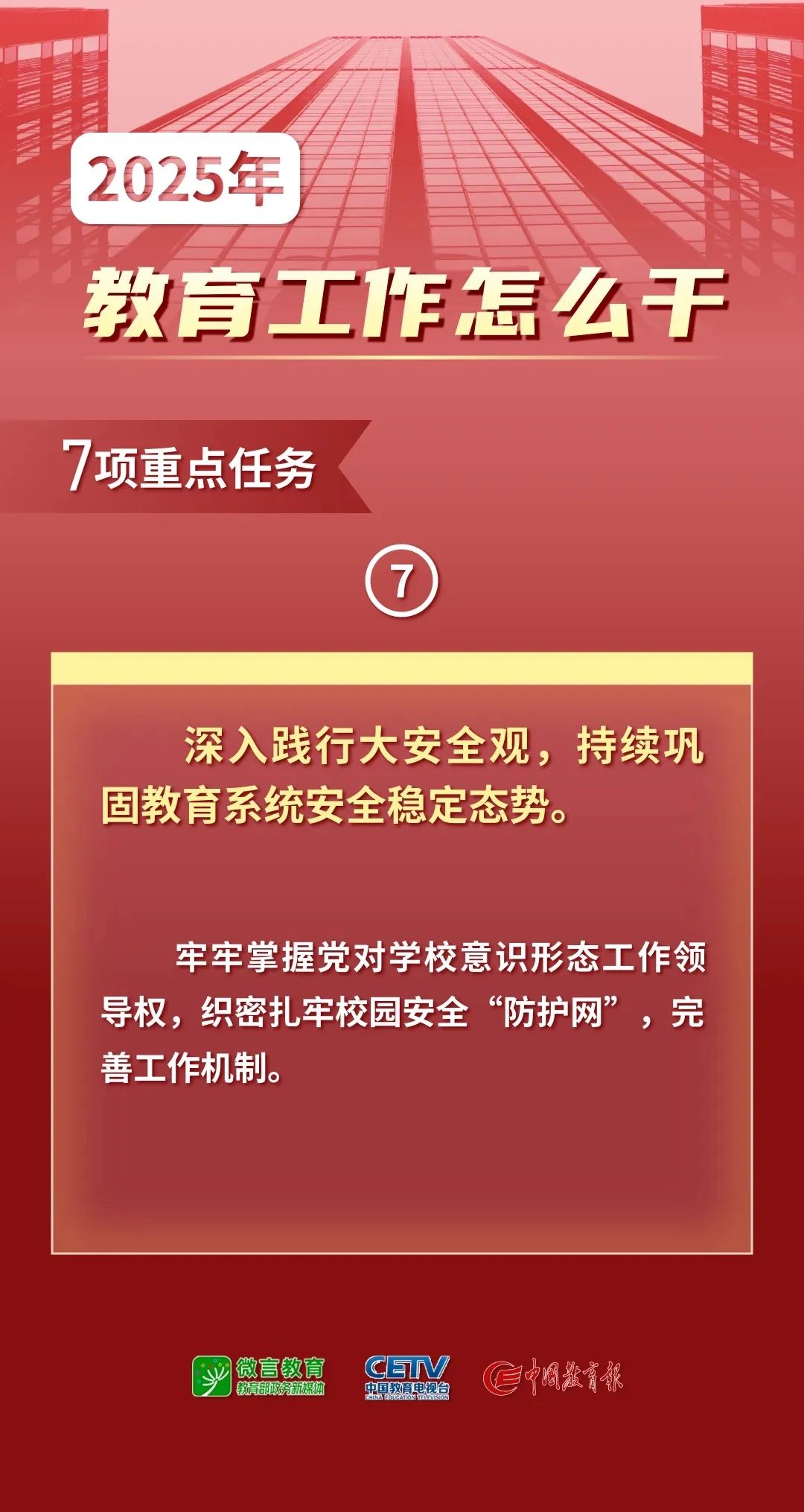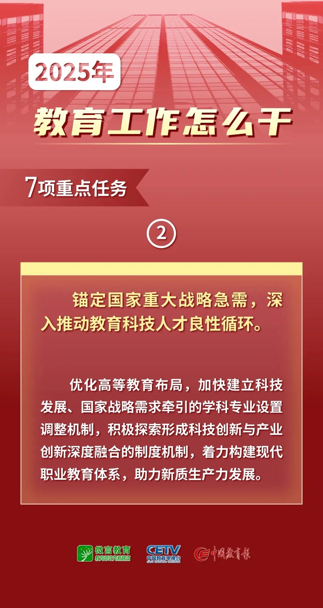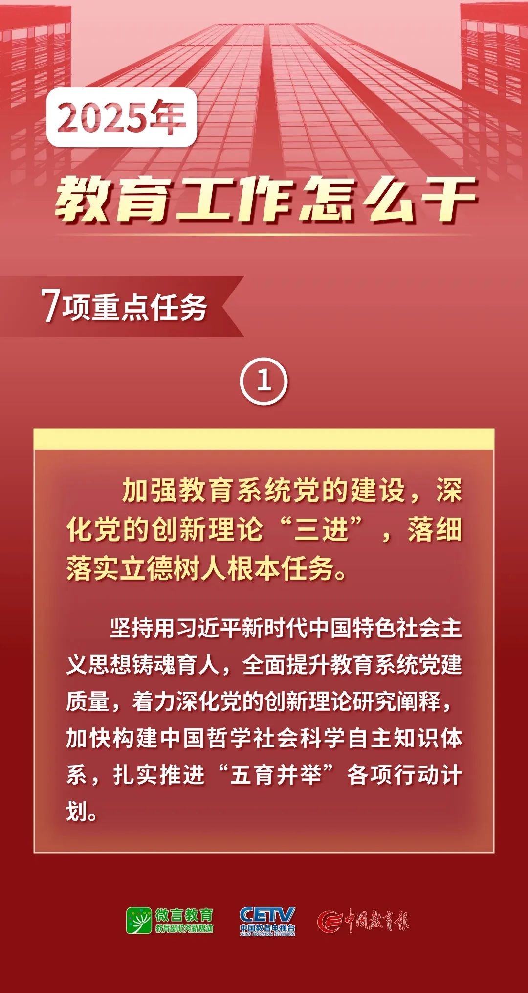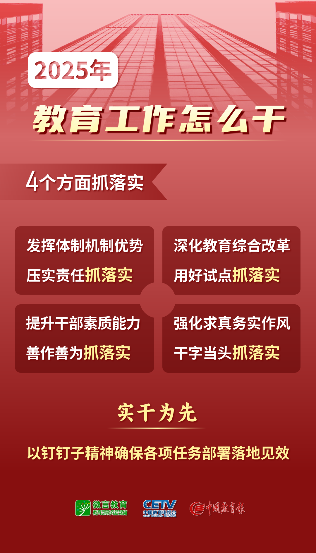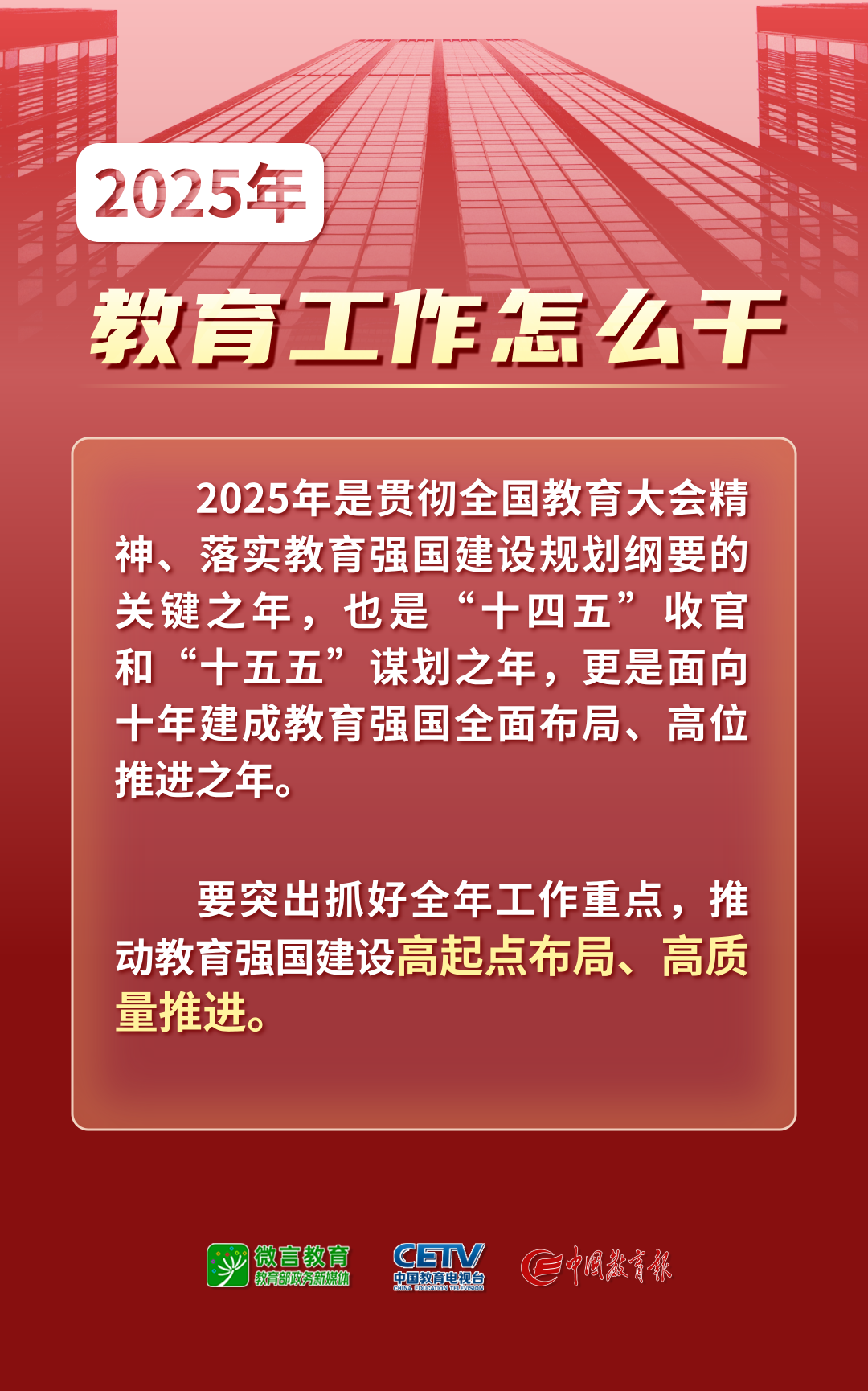 1月9日—10日,2025年全國教育工作會議在北京舉行。會議以習近平新時代中國特色社會主義思想為指導,全面貫徹落實黨的二十大和二十屆二中、三中全會精神,深入學習貫徹全國教育大會精神和習近平總書記關于教育的重要論述,總結(jié)工作、分析形勢,統(tǒng)一思想、凝聚共識,圍繞組織實施教育強國建設規(guī)劃綱要,安排布置年度重點任務,確保教育強國建設高起點布局、高質(zhì)量推進。