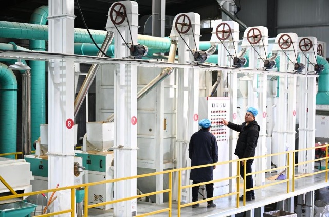 2025年1月10日,“95后”返鄉(xiāng)創(chuàng)業(yè)大學(xué)生任宏宇(右)在陜西省榆林市米脂縣米森農(nóng)業(yè)發(fā)展有限公司的生產(chǎn)車間與工人交流設(shè)備運(yùn)行情況。新華社記者張博文 攝