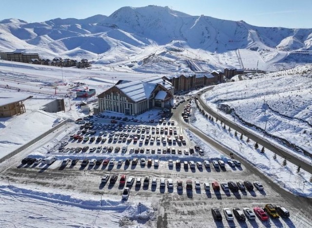 游客的車輛停在新疆阿勒泰將軍山國(guó)際滑雪度假區(qū)游客服務(wù)中心旁(2025年1月24日攝,無人機(jī)照片)。新華社記者 胡虎虎 攝