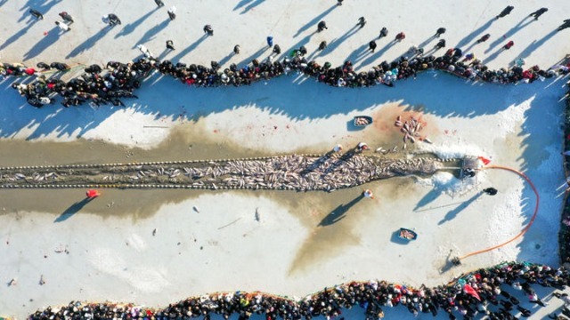 一眼望不到邊的查干湖冰面上,口噴熱氣的馬匹拖動(dòng)絞盤,2000米長(zhǎng)的漁網(wǎng)被從湖水中拖出,一條條肥碩的湖魚在冰上搖頭擺尾,捕魚人露出收獲的笑容,圍觀游客發(fā)出陣陣驚嘆與喝彩。