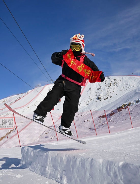 雪友在新疆阿勒泰將軍山國(guó)際滑雪度假區(qū)滑雪迎新春(2025年1月28日攝)。新華社記者 胡虎虎 攝