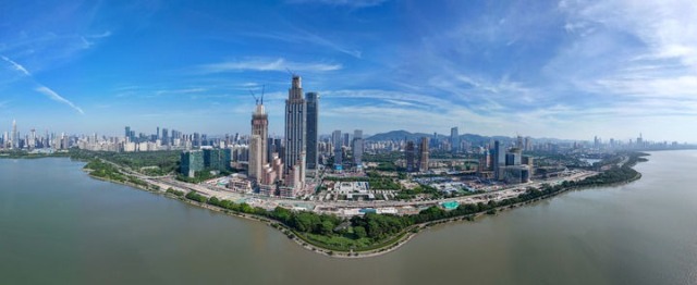2024年10月3日拍攝的正在建設(shè)中的深圳灣超級(jí)總部基地(無(wú)人機(jī)全景照片)。新華社記者 梁旭 攝