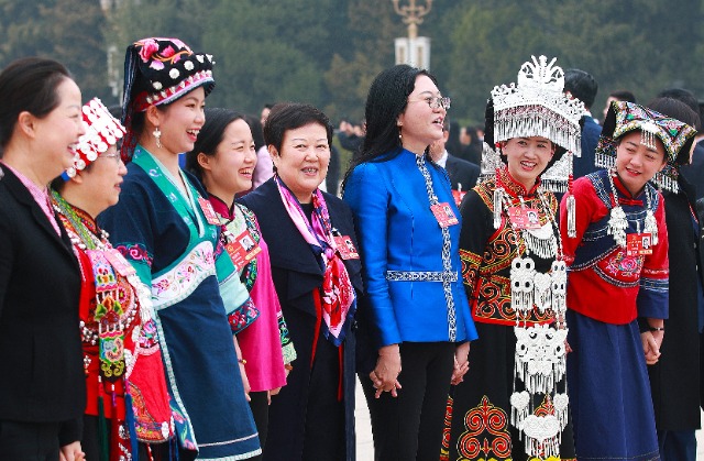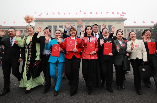 十四屆全國人大三次會議11日下午3時在人民大會堂舉行閉幕會。圖為貴州代表團部分代表進場前獻歌。中國教育報-中國教育新聞網(wǎng)記者 張學軍 攝