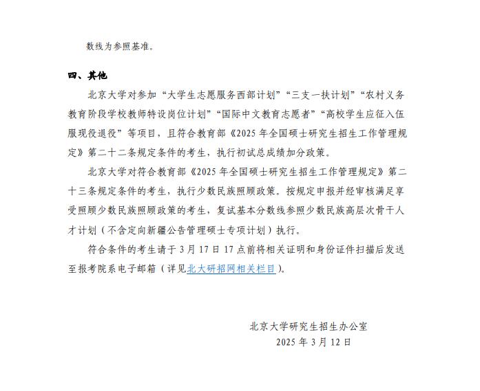 符合教育部規(guī)定并在網(wǎng)上報名時申請享受初試加分政策的考生可于3月14日前登錄我校采集系統(tǒng)(https://yz2025.bnu.edu.cn/www/ss/csjf/login)提交相關(guān)證明材料,未按規(guī)定提交材料的,不享受相應(yīng)加分政策。我校根據(jù)教育部最新文件及名單審核考生資格,符合資格的考生將享受初試成績總分加分(單科不加分)。