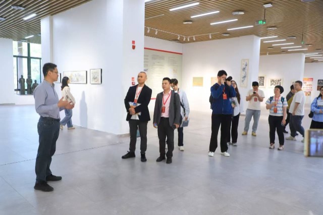 美術(shù)學(xué)院副院長(zhǎng)鄭志強(qiáng)為媒體記者團(tuán)介紹作品。