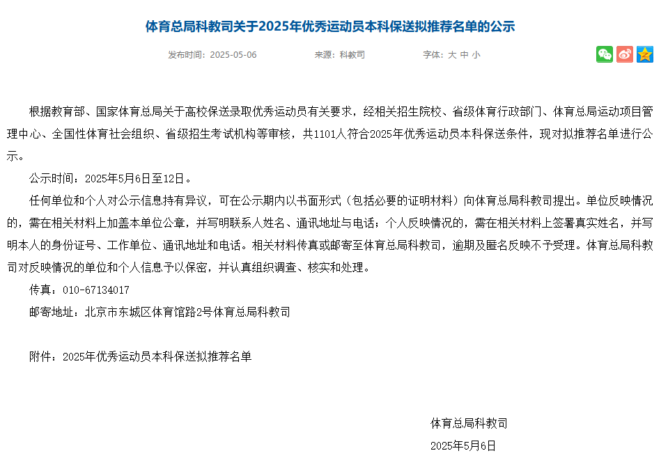 體育總局科教司關(guān)于2025年優(yōu)秀運(yùn)動員本科保送擬推薦名單的公示