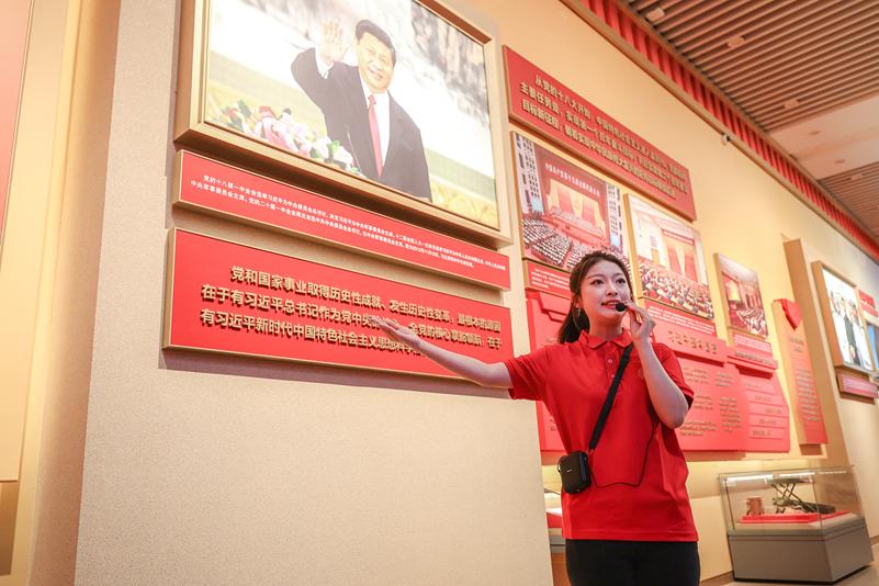 中國教育報(bào)-中國教育新聞網(wǎng)訊(記者 焦以璇)“大家現(xiàn)在所在的一層中央大廳共展出各型飛機(jī)23架,其中地面陳列16架,空中懸掛7架?!薄按蠹铱?!這是邊防官兵執(zhí)行任務(wù)中使用的黨旗、官兵寫在羊皮褥子上的請戰(zhàn)書”……近日,在中國人民革命軍事博物館里,北京聯(lián)合大學(xué)的學(xué)生講解員用貼近青年思維的語言為本校2024級參訓(xùn)學(xué)生講述著強(qiáng)軍故事。