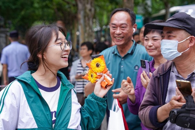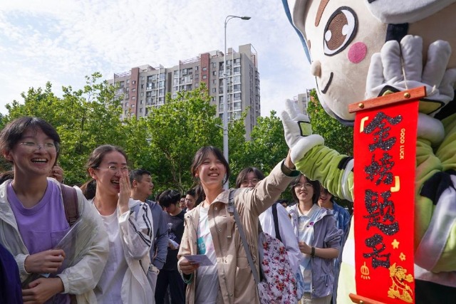 在江蘇省南京市建鄴區(qū)中華中學(xué)考點,考生與送考人偶擊掌(2024年6月7日攝)。新華社記者 李博 攝