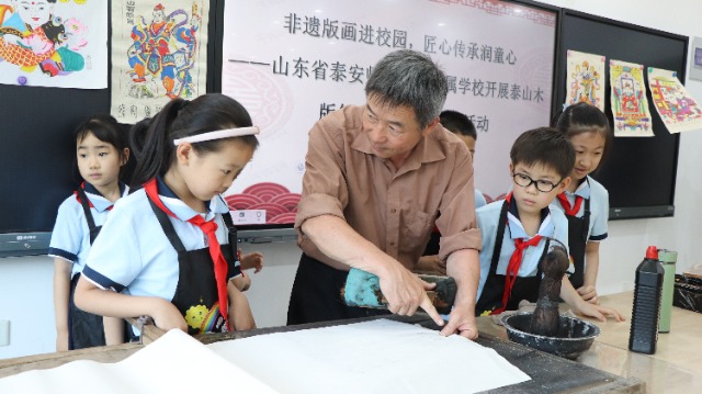 泰山木版年畫(huà)非遺傳承進(jìn)校園活動(dòng)現(xiàn)場(chǎng)。泰安師范學(xué)校附屬學(xué)校供圖