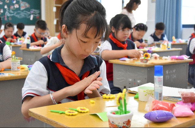 7月4日,鹽城市大慶路實(shí)驗(yàn)學(xué)校暑托班學(xué)生在上手工課。